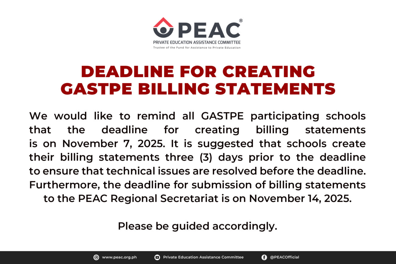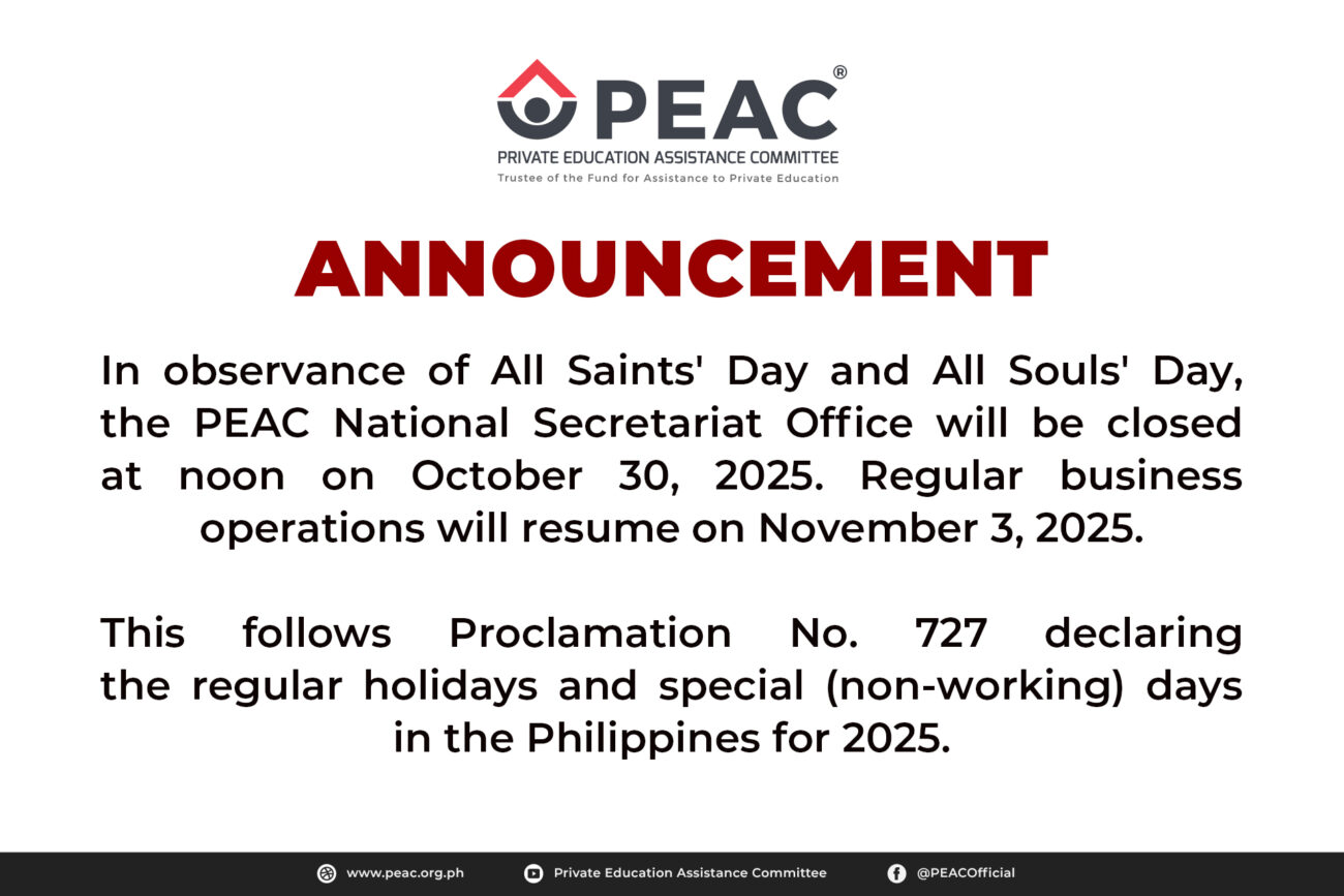 546865508_798542269491800_382454255878745957_n546865508_798542269491800_382454255878745957_n546865508_798542269491800_382454255878745957_n546865508_798542269491800_382454255878745957_n544804877_795193059826721_3491794570935599714_n542868589_792893630056664_8826169294736425999_n542647620_792893586723335_4262335283863774119_n508382424_734141415931886_6040107666185171131_n508382424_734141415931886_6040107666185171131_n481360947_648282207851141_3939958832215630278_n508382424_734141415931886_6040107666185171131_n464861578_560284566650906_931507676381504836_nFile464861578_560284566650906_931507676381504836_n442488180_456561153689915_4308220084288643583_n391411754_325409616805070_6892879592419794113_n Quick Links Enterprise Information System (EIS) Voucher Management System (VMS) 2025-2026 INSET and PEAC Internally Funded Trainings Registration Final List of Schools for eRecertification SY 2025-2026 Final List of Schools for eCertification Revisit SY 2025-2026 Final List of Schools for eRecertification Revisit SY 2025-2026 Schedule of Schools to Undergo eRecertification Revisit for SY 2025-2026 Schedule of Schools to Undergo eRecertification for SY 2025-2026 Schedule of Schools to Undergo eCertification Revisit for SY 2025-2026 News & Gallery PEAC Regular Meting last October 10, 2025PEAC Statement: The Solution to K to 12 Challenges is to Progress, not RegressPEAC Annual Report for FY 2023-2024 is now availablePEAC Proposes Amendments to RA 8545 on the Expansion of ESC to K-6PEAC Regular Meting last June 17, 2025 View More Announcements PEAC Annual Report FY 2023-2024 ErratumPEAC issues CoRE Batch 5 guidelines for school year 2025-2026PEAC Regional Secretariat in NIRRECAST call for proposals for SY 2025-2026PEAC Annual Report for FY 2023-2024 is now availablePEAC Proposes Amendments to RA 8545 on the Expansion of ESC to K-6PEAC Regional Program Directors and Regional Program Coordinators for SY 2025-2026 View More Calendar of Events PEAC-Certification Readiness Training (PEAC-CERT) for Association of Philippine Schools Overseas on November 10, 2025 8:00 am Training for School Administrators on the Strengthened SHS Curriculum (Cebu City) on January 13, 2026 8:00 am Training for School Administrators on the Strengthened SHS Curriculum (Naga City) on January 26, 2026 8:00 am Training for School Administrators on the Strengthened SHS Curriculum (Dumaguete City) on March 19, 2026 8:00 am View Calendar >> PEAC and the Programs of Assistance to the Private Schools Watch more videos by subscribing to the official PEAC Youtube channel.