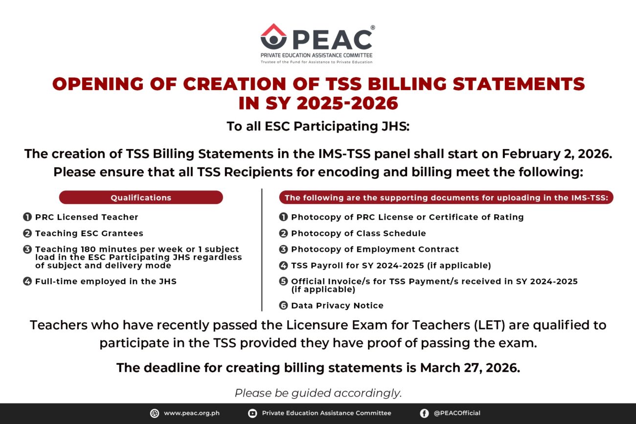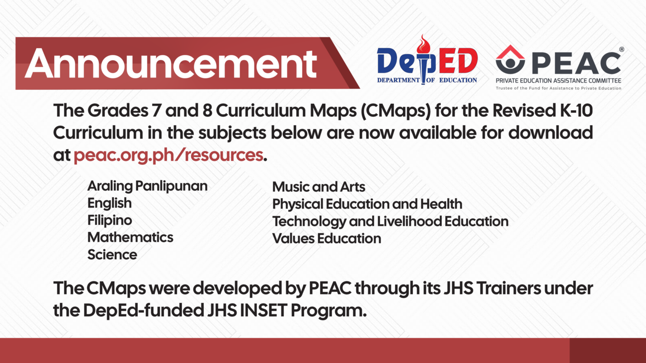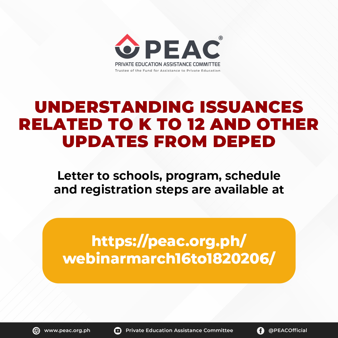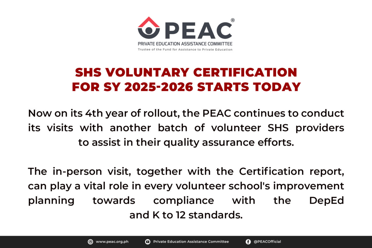 464861578_560284566650906_931507676381504836_n464861578_560284566650906_931507676381504836_n464861578_560284566650906_931507676381504836_n464861578_560284566650906_931507676381504836_n464861578_560284566650906_931507676381504836_n464861578_560284566650906_931507676381504836_n546865508_798542269491800_382454255878745957_n546865508_798542269491800_382454255878745957_n544804877_795193059826721_3491794570935599714_n508382424_734141415931886_6040107666185171131_n442488180_456561153689915_4308220084288643583_n391411754_325409616805070_6892879592419794113_n Quick Links Enterprise Information System (EIS) Voucher Management System (VMS) PEAC Internally Funded Trainings Registration Final List of Schools to undergo eCertification for SY 2025-2026 Final List of Schools for eRecertification SY 2025-2026 Final List of Schools for eCertification Revisit SY 2025-2026 Final List of Schools for eRecertification Revisit SY 2025-2026 Schedule of Schools to Undergo eCertification for SY 2025-2026 Schedule of Schools to Undergo eRecertification Revisit for SY 2025-2026 Schedule of Schools to Undergo eRecertification for SY 2025-2026 Schedule of Schools to Undergo eCertification Revisit for SY 2025-2026 Schedule of In-Person K to 6 Voluntary Certification for SY 2025-2026 News & Gallery In Photos: PEAC Fellowship Dinner and Christmas PartyPEAC conducts Certification Readiness Training (PEAC-CeRT) for APSO member schoolsPEAC Regular Meting last October 10, 2025PEAC Statement: The Solution to K to 12 Challenges is to Progress, not RegressPEAC Annual Report for FY 2023-2024 is now available View More Announcements PEAC Annual Report FY 2023-2024 ErratumPEAC issues CoRE Batch 5 guidelines for school year 2025-2026PEAC Regional Secretariat in NIRRECAST call for proposals for SY 2025-2026PEAC Annual Report for FY 2023-2024 is now availablePEAC Proposes Amendments to RA 8545 on the Expansion of ESC to K-6PEAC Regional Program Directors and Regional Program Coordinators for SY 2025-2026 View More Calendar of Events Training for School Administrators on the Strengthened SHS Curriculum (Cagayan De Oro City) on February 26, 2026 8:00 am Training for School Administrators on the Strengthened SHS Curriculum (Dumaguete City) on March 19, 2026 8:00 am Transforming Philippine Education through Effective Policy Reforms on July 8, 2026 View Calendar >> PEAC and the Programs of Assistance to the Private Schools Watch more videos by subscribing to the official PEAC Youtube channel.