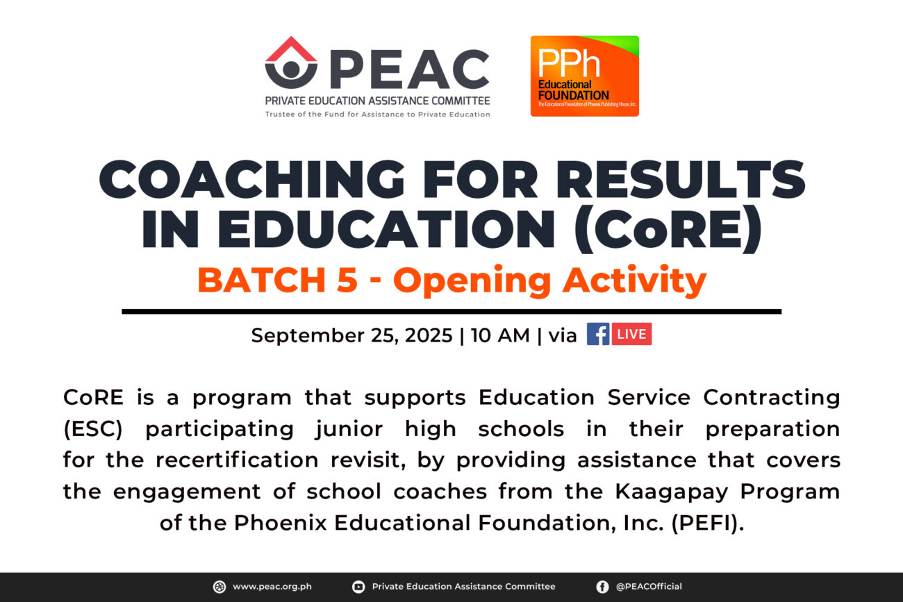 The Private Education Assistance Committee (PEAC) issues the guidelines of the Coaching for Results in Education (CoRE), for school year 2025-2026. CoRE is a program that supports Education Service Contracting (ESC) participating junior high schools in their preparation for the recertification revisit by providing assistance that covers the engagement of school coaches from the Kaagapay Program of the Phoenix Educational Foundation Inc. (PEFI).