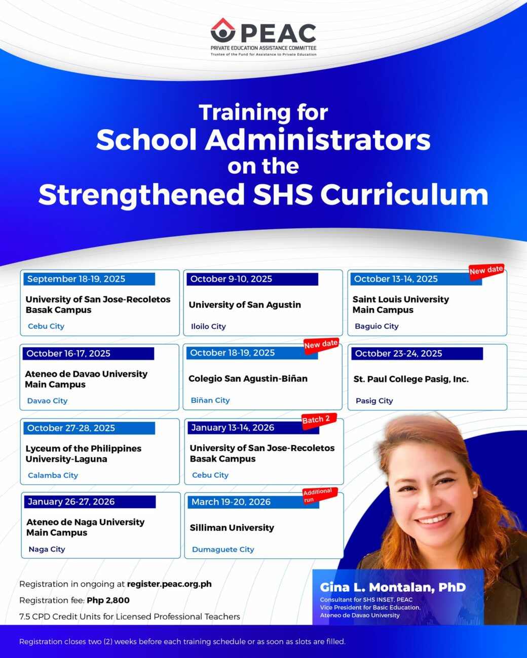 In light of the recent postponement due to the typhoons, PEAC would like to share the updated training schedules of the Training for School Administrators on the Strengthened SHS Curriculum.